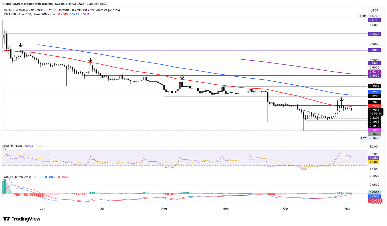 截至周一发稿时,Pi Network股价跌破0.2400USD,面临第三回调的风险,此前该股曾在5月21日、6月25日和8月十日从50日均线反弹后出现过类似状况。此次从均线反弹或许会测试十月11日低点所形成的0.1919USD支撑位。