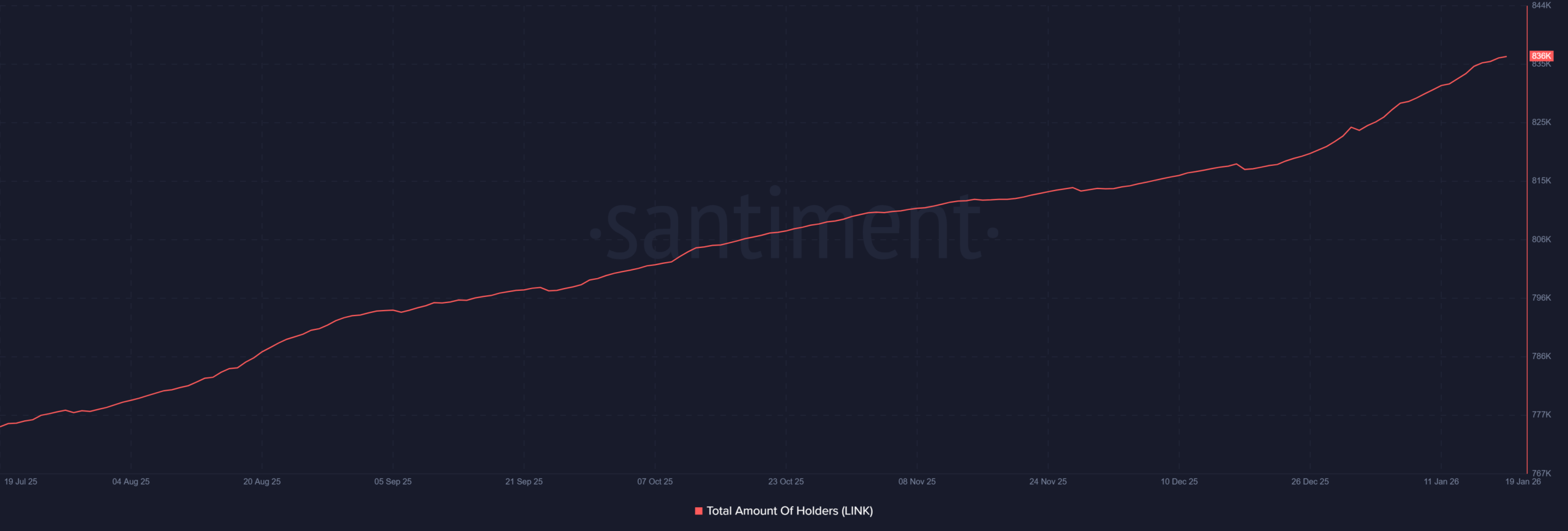 链上指标提供了更多线索。LINK 代币持有者数目在过去几周持续增长,表明尽管参与者群体可能正在缩小,但整体参与度依旧维持稳定。