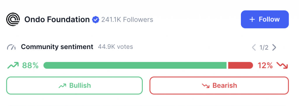 来源:硬币市值尽管近期价格下跌,但 ONDO 社区好像对潜在的上涨相当乐观。依据硬币市值的社区情绪数据,约88%的市场人士看好ONDO最近的上涨。同时,大约 12% 的人对该资产的上涨没信心。