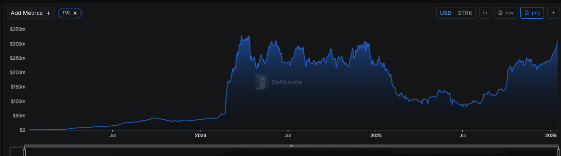 但经过一年多时间的卧薪尝胆,Starknet 目前已经能和大部分 L1 掰掰手腕。据 DeFiLlama 数据,Starknet 的 TVL 自 2025 年 9 月开始回升,现在已超 3 亿USD,回到了 2025 年的水平。在区块链排名上位列第 22,超越了 Monad、Scroll、Linea、Sei 等一众 L1 和 L2。