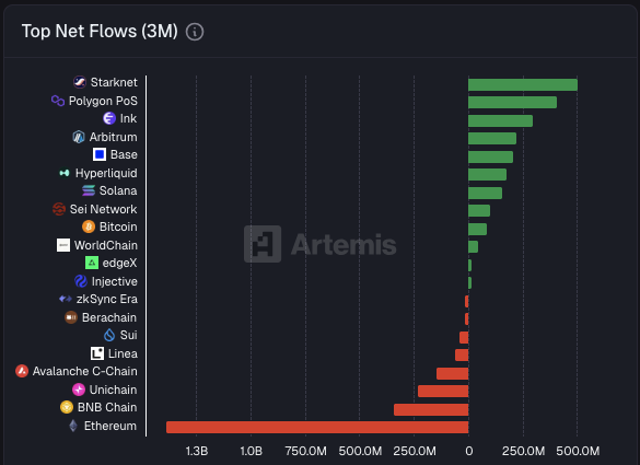 不要简单地把 Starknet 视作区块链中“小众喜好者”的聚集地,事实上,Starknet 已获得了外部资金喜爱,并且留存度较高。据 Artemis 数据,Starknet 3 个月资金净流入量达 5.042 亿USD,位居区块链榜首,2、 Polygon 与其相差 1 亿USD,远远甩开了 SOL 和 BSC 等区块链。
