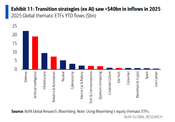 研报称,即使人工智能热潮冷却,电网升级和国防开支的刚性需要依旧存在。事实上,剔除人工智能后的转型方案在2025年已吸引了超越400亿USD的资金流入。