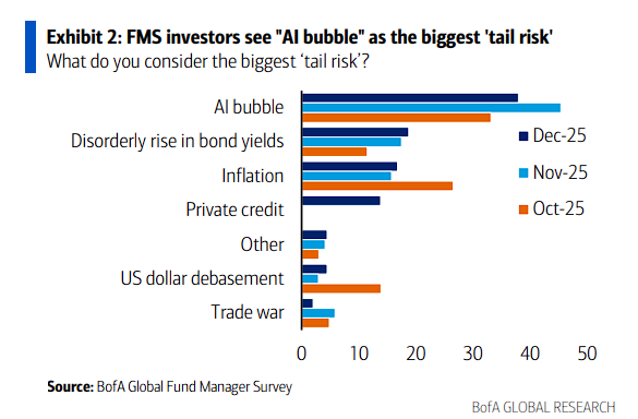 38%的基金经理目前将“人工智能泡沫”视为最大的尾部风险。
