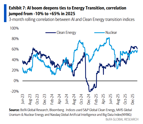 然而,研报称,市场正在飞速意识到这种联系。清洗能源与人工智能的有关性在一年内从|10%暴涨至65%。