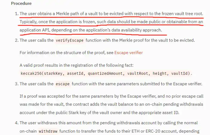 但这里存在一个问题:用 StarkEx 策略的 L2 大多是 Validium(譬如 Immutable X 和 ApeX),并不会把 DA 所需的数据发布到 以太币,架构目前 L2 状况树的信息都存在链下。假如用户没办法在链下获得架构 Merkle Proof 的数据(譬如链下 DA 层发动数据扣留攻击),是没办法通过逃生舱来提款的。