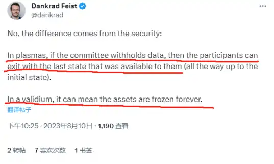 对此,Dankrad 表示,Plasma 用户在 DA 不可用时(就是指链下的 DA 层互联网搞数据扣留,不公开买卖数据),仍然可以把我们的资产安全撤出至 L1;但相同的状况下,Validium(大部分使用 StarkEx 策略的项目都是 validium)却可以让用户没办法撤资至 L1,把钱冻住。