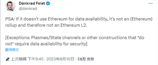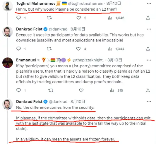 Dankrad 此言一出,便引来了很多 Rollup 范围的 Founder 或 Researcher 质疑。毕竟有很多「Layer2」项目为了节省本钱,并没使用 以太币 作为 DA( 数据可用性 ) 层,假如把这类项目踢出 L2 名单,势必波及到相当多的扩容互联网;同时,假如 validium 不算 L2,Plasma 应该也没资格算作 L2。