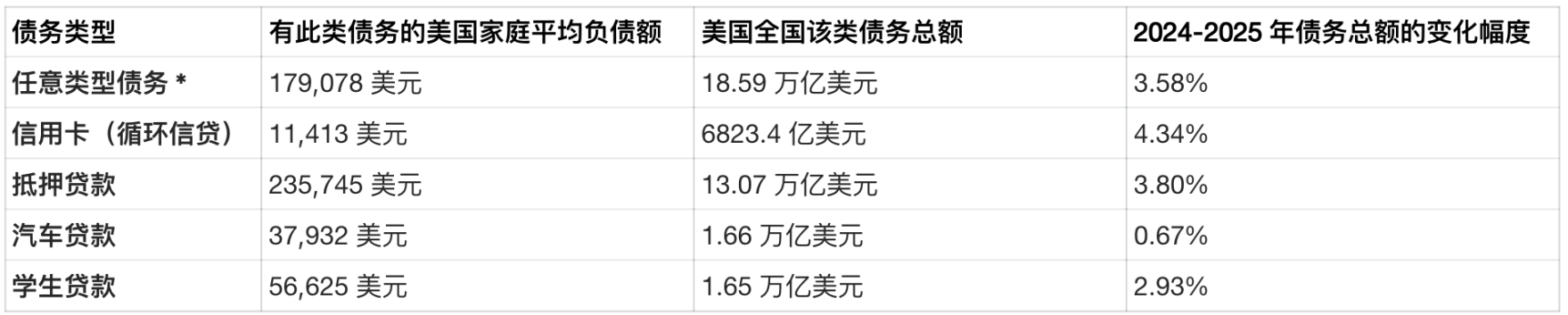 12.68 万亿USD信用卡债务:9,150 亿USD学生贷款债务:5,470 亿USD