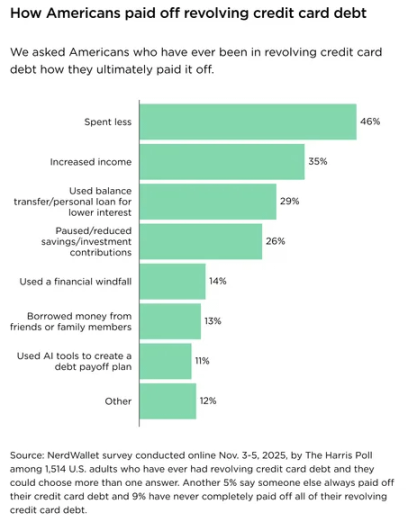 这是 NerdWallet 联合哈里斯民意调查(2025 年 11 月 3|5 日)对 1514 名曾背负循环信用卡债务的美国成年人的调查,受访者可多选还款方法。主要还款方法及占比: