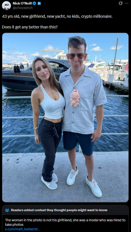 X 平台用户 @chooserich 的帖子:该用户炫耀自己是 43 岁的数字货币百万富翁,正和模特女朋友乘游艇度假,但网友指出其内容涉嫌造假