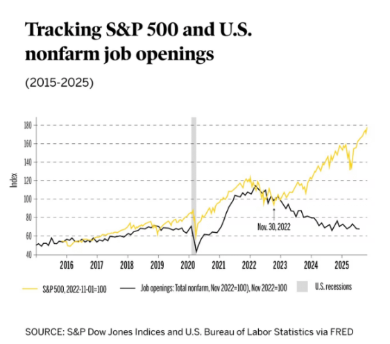 标普道琼斯指数图表:显示 2025 年 11 月后,股市持续走高但就业职位数目骤降,并用「衰退区间」标注了劳动力市场疲软的阶段