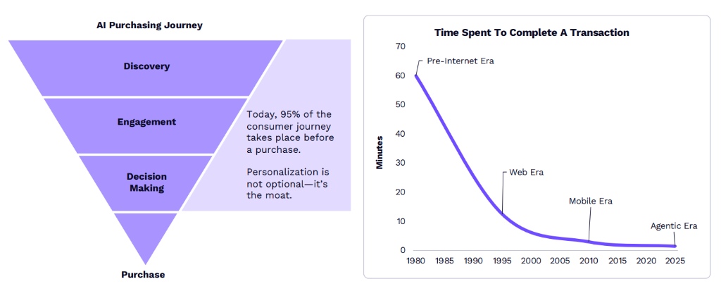 这种转变正在压缩购物漏斗。从网络前年代完成一次购买需要约1小时,到移动年代缩短至数分钟,而在人工智能代理年代进一步压缩至约90秒。人工智能购物代理正在以前所未有些个性化和速度改变购买漏斗,现在95%的买家旅程发生在购买之前,个性化不再是可选项,而是护城河。