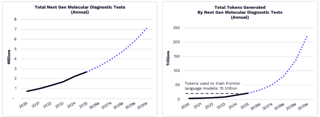 这将推进测序需要激增,下一代分子诊断测试的数目预计将从2025年的不足百万次增长到2030年的约700万次,每年产生的token数据量可能达到约2000亿,超越了练习Open人工智能、Gemini、Anthropic和x人工智能等前沿语言模型所用的150万亿tokens的规模。