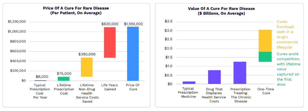 生物治愈的市场潜力特别惊人。ARK研究显示,治愈罕见疾病的平均价格现在可能超越100万USD,是管理疾病所需终身处方成本的近15倍。治愈药物可以在专利到期前从大多数病人群体中获得收入,可能比典型药物价值高20倍,比治疗慢成人两性疾病的处方药价值高2.4倍。
