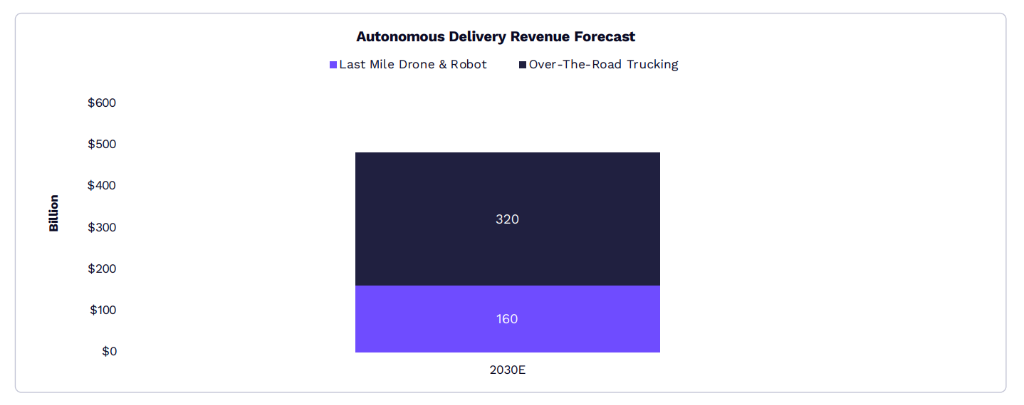 自动驾驶物流同样前途远大。完全智能化的最后一公里配送——无论是通过无人机还是地面机器人——已在全球年化超越400万次。无人驾驶长途卡车运输已在美国启动,运营商正计划迅速扩展路线。ARK预测,到2030年,全球自动配送收入可能达到4800亿USD,监管和后端装载操作的智能化将是关键的限制原因。