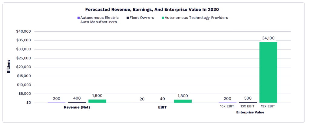 市场价值潜力巨大。ARK估计,到2030年,自动驾驶出租车可能创造约34万亿USD的企业价值,其中自动驾驶技术提供商将获得约98%的EBIT(息税前收益)和企业价值,汽车制造商和车队运营商的份额相对较小。这一预测的主要风险在于除Tesla外的汽车制造商能否以足够快的速度扩大其自动驾驶出租车队规模。
