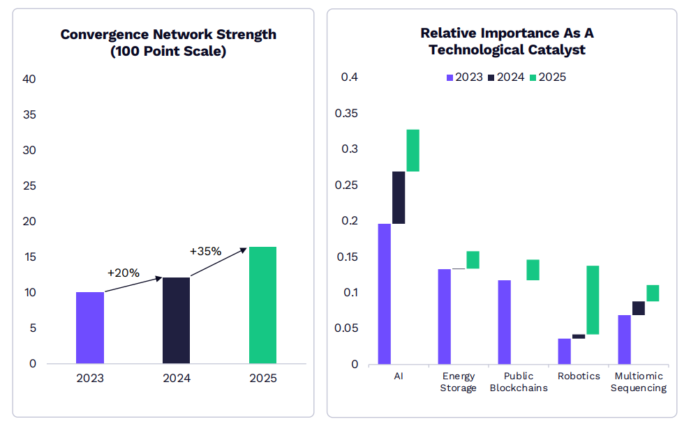 ARK用一个指标来描述这种状况:技术收敛强度(Convergence Network Strength)。到2025年,这一指标同比提高了35%——意味着不同技术之间的相互催化正在明显加快。这也是为何ARK把2026年称为:The Great Acceleration(大加速年代)。