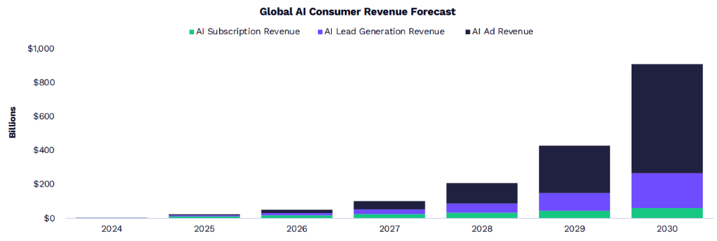 到2030年,人工智能代理可能产生约9000亿USD的商业和广告收入,其中主导增长原因是潜在顾客生成和广告,远超买家订阅收入的贡献。