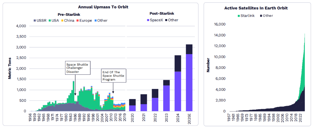 2025年,每年送入轨道的水平达到历史新高,SpaceX占据主导地位。该公司拥有超越9000颗活跃的Starlink卫星,约占地球轨道所有活跃卫星的66%。