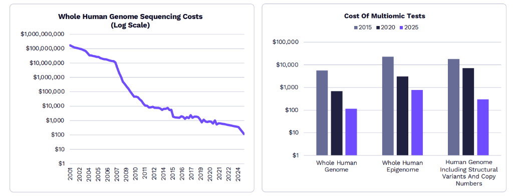 数据生成本钱正在急剧降低。全基因组测序本钱可能在2030年降至10USD,比2025年降低约10倍。