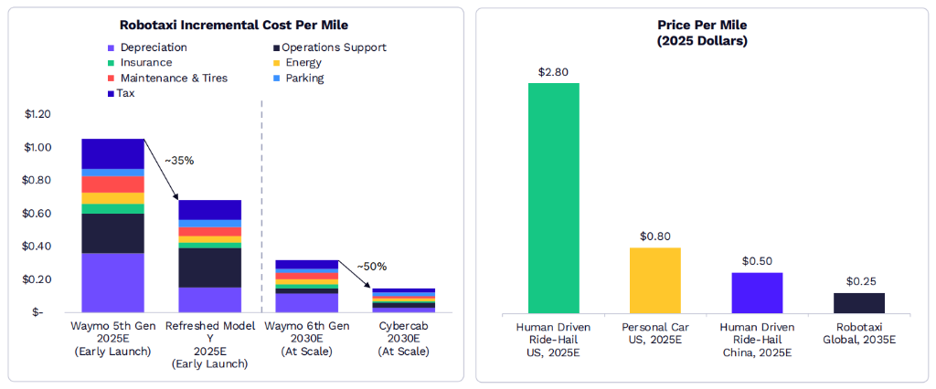 本钱降低将是推进需要的重点。ARK预测,到2035年,全球自动驾驶出租车的每英里价格可能降至0.25USD,远低于2025年美国人工驾驶网约车的2.80USD和私家车的0.80USD。在早期商业化阶段,汽车本钱将主导单位经济效益,而规模化后汽车借助率将推进每英里本钱降低。
