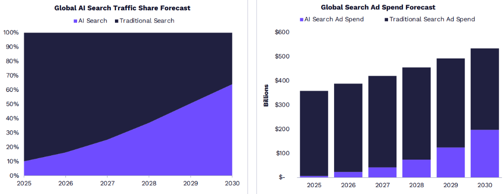 人工智能搜索流量份额预计将从2025年的10%增长到2030年的65%,人工智能有关搜索广告支出年增长率约为50%。