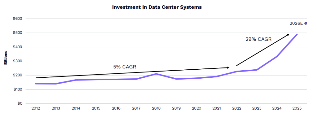 数据中心系统投资的增长速度正在加速。自ChatGPT发布以来,这种投资的年化增长率从此前的5%跃升至29%。