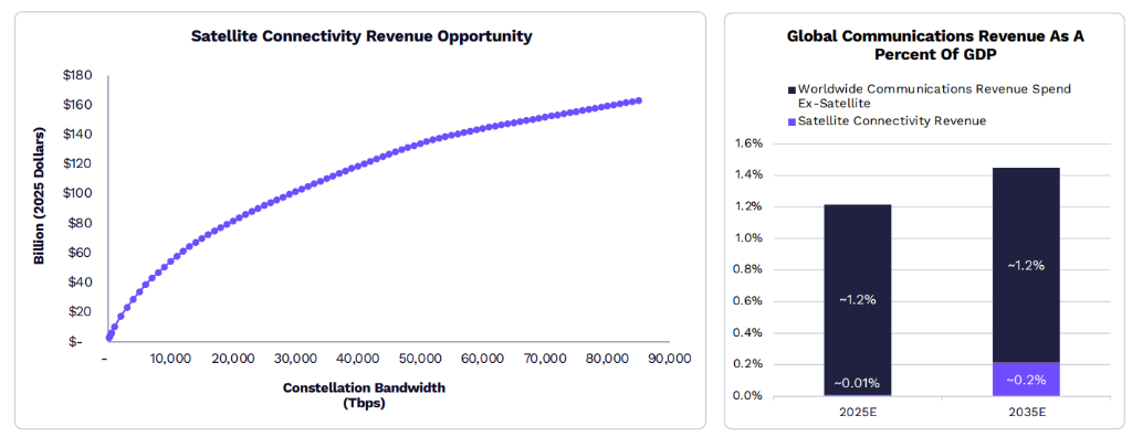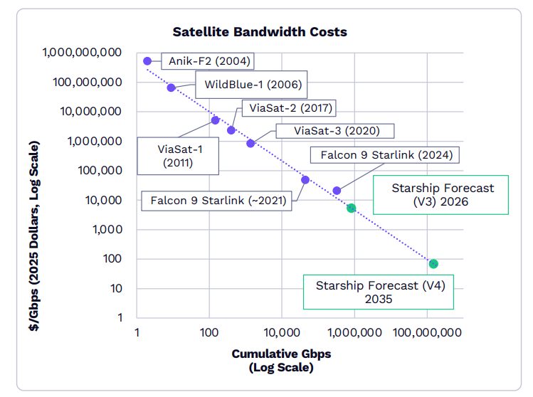 卫星带宽本钱同样在降低。依据赖特定律,卫星带宽本钱每累计轨道千兆比特每秒(Gbps)翻倍应降低约44%,这使卫星连接可以补充蜂窝塔,在美国全境提供无处不在的移动覆盖。