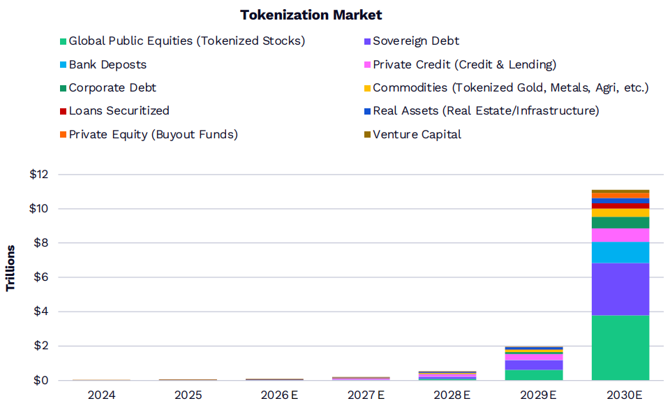 革新类资产的市场份额将从2025年的约20%增长到2030年的约50%,市值规模可能从现在的约5万亿USD扩张至28万亿USD左右。