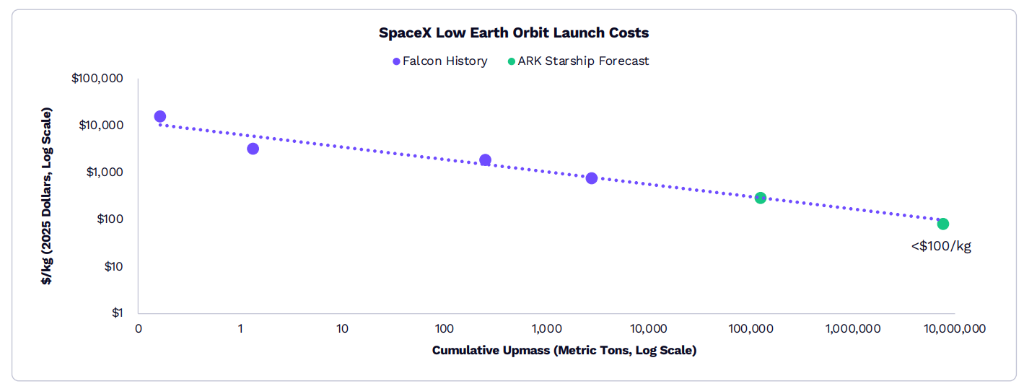 发射本钱持续降低。依据赖特定律(Wright's Law),每累计发射水平翻倍,发射本钱应降低约17%。自2025年以来的17年间,借助猎鹰9号的部分可重复用性,SpaceX已将本钱削减约95%,从每公斤约1.56万USD降至不到1000USD。ARK研究表明,Starship可以将这一轨迹延续到规模化时的每公斤100USD以下。