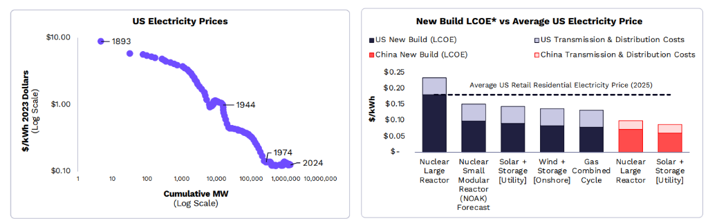 多组学数据的本钱狂跌。太阳能和电池本钱继续遵循赖特定律降低,核能本钱降低在1970年代因监管变化而中断,但美国最近的行政命令应会推进核能重回此前的本钱降低轨迹。历史上,太阳能和核能本钱(按兆瓦计)与电池本钱(按兆瓦时计)在每次累计容量翻倍时都会大幅降低。