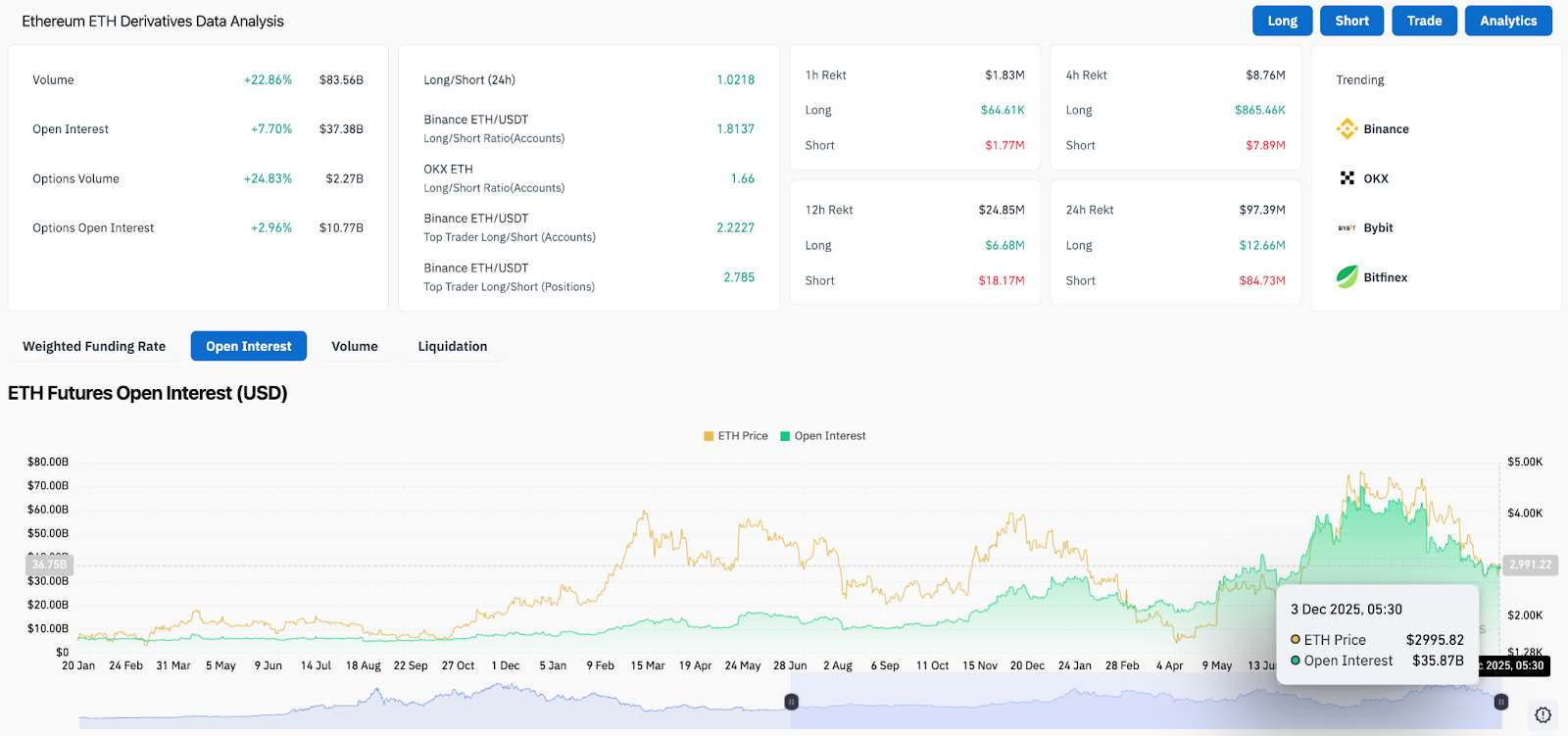 ETH衍生品剖析(来源:Coinglass)衍生品数据显示市场仓位发生了变化。ETH期货未平仓合约量增长7.7%至373.8亿USD,成交量增长超越22%。期权买卖活动增长近25%,未平仓合约量攀升至108亿USD附近。