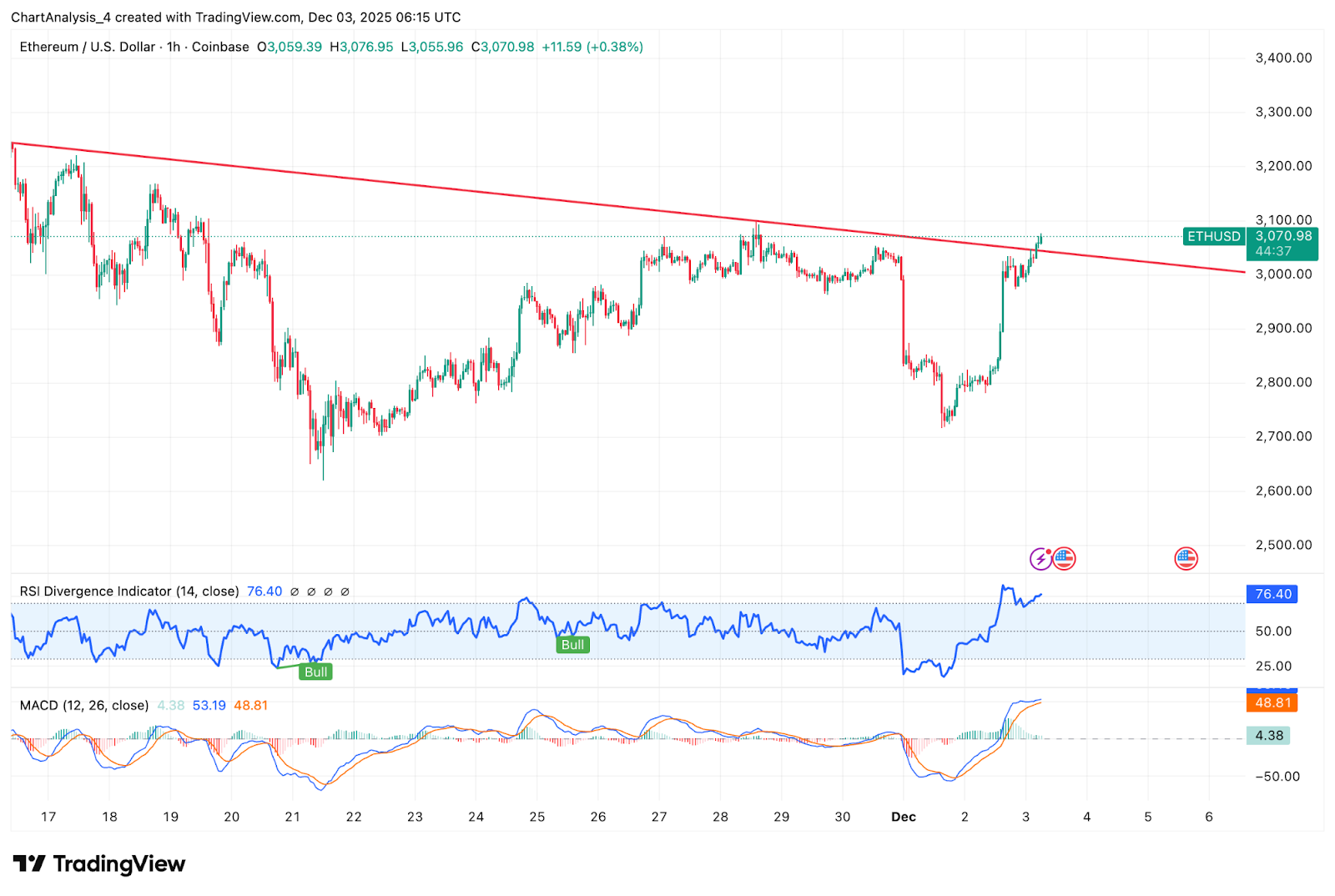 ETH价格今日突破一条降低趋势线,接近 3070 USD。该趋势线自 10 月下旬以来一直妨碍着所有反弹。此举使用户在大型对称三角形结构内获得短期优势,但来自 EMA 集群和超级趋势上限的上方阻力继续限制着上涨动能。