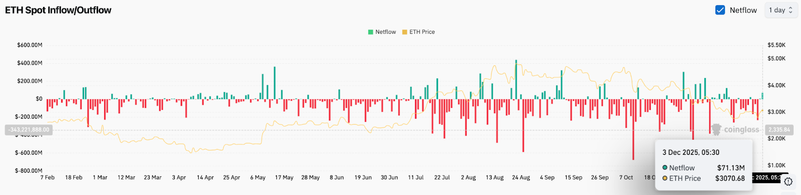 ETH互联网流量(来源:Coinglass)现货资金流动数据显示,12月3日净流入资金达7100万USD。这标志着资金流动模式从11月大多数时间的很多派发转向,并且与突破阻力位的时间点相吻合。历史上,突破期间的正向资金流动一般会提升突破持续的可能性,特别是在资金流入持续多个买卖日的状况下。