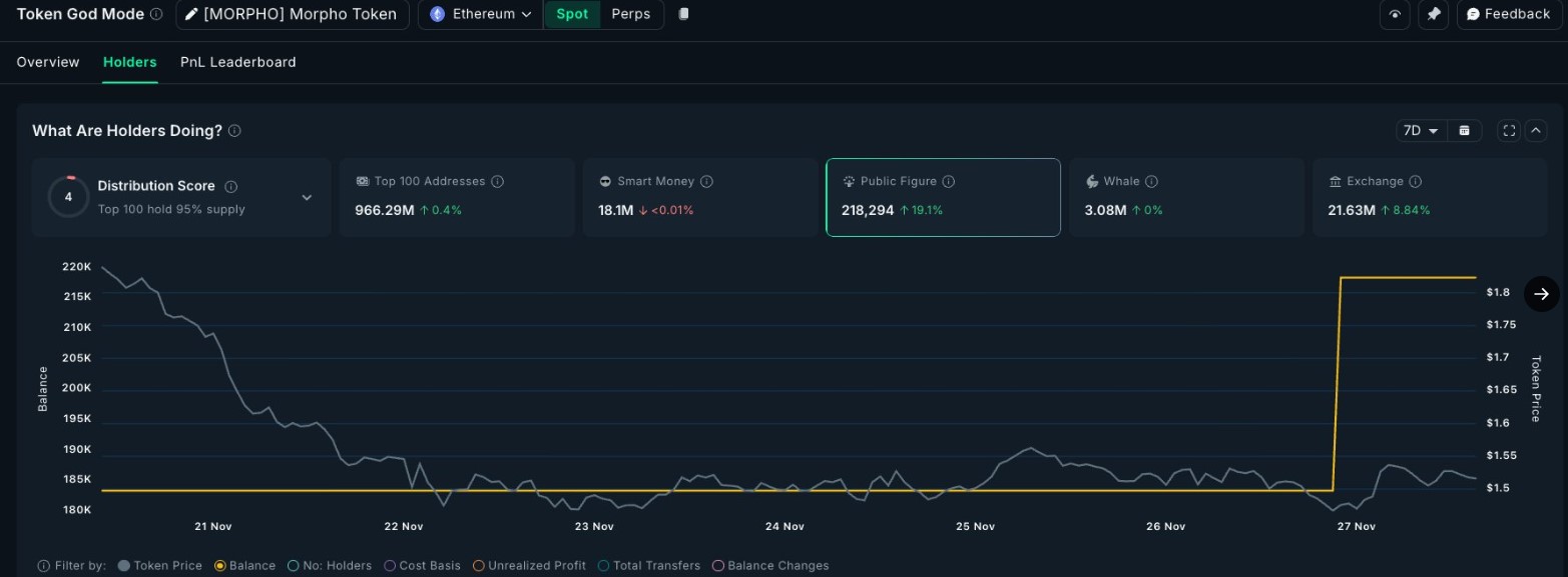 最新的链上数据显示,公众人物和知名数字货币人士,比如孙宇晨,大幅增持了MORPHO代币。他本周购入了35000枚代币。