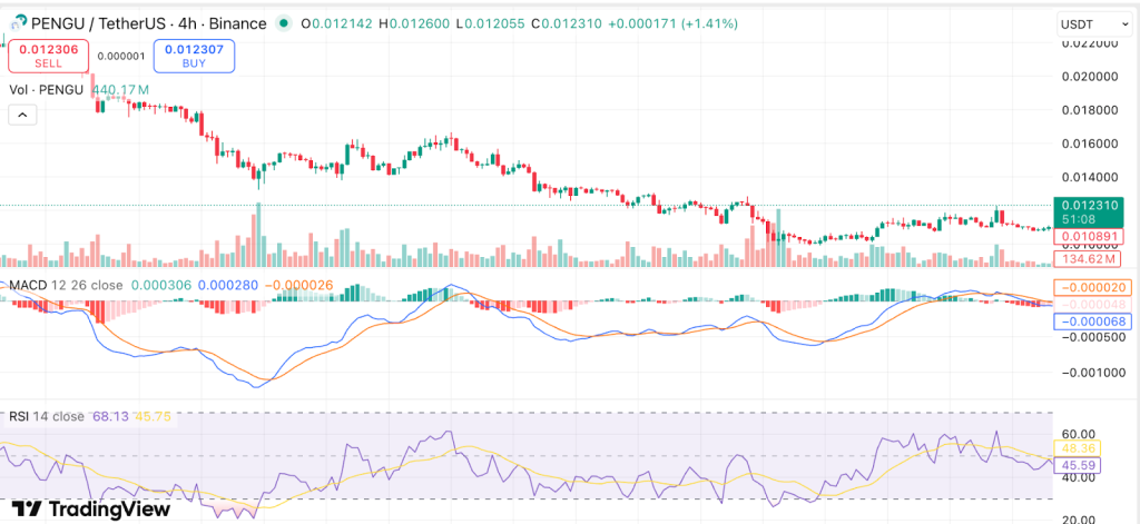 $PENGU 已重新站上重点移动平均线,包含 10 日均线。欧洲药品管理局20日均线也出现反弹,预示着趋势可能出现早期反转。相对强弱指数(RSI)从26跃升至45,表明市场出现强劲吸收,同时移动平均收敛/发散指标(MACD)柱状图转正并大幅上涨,表明短期动能看涨。