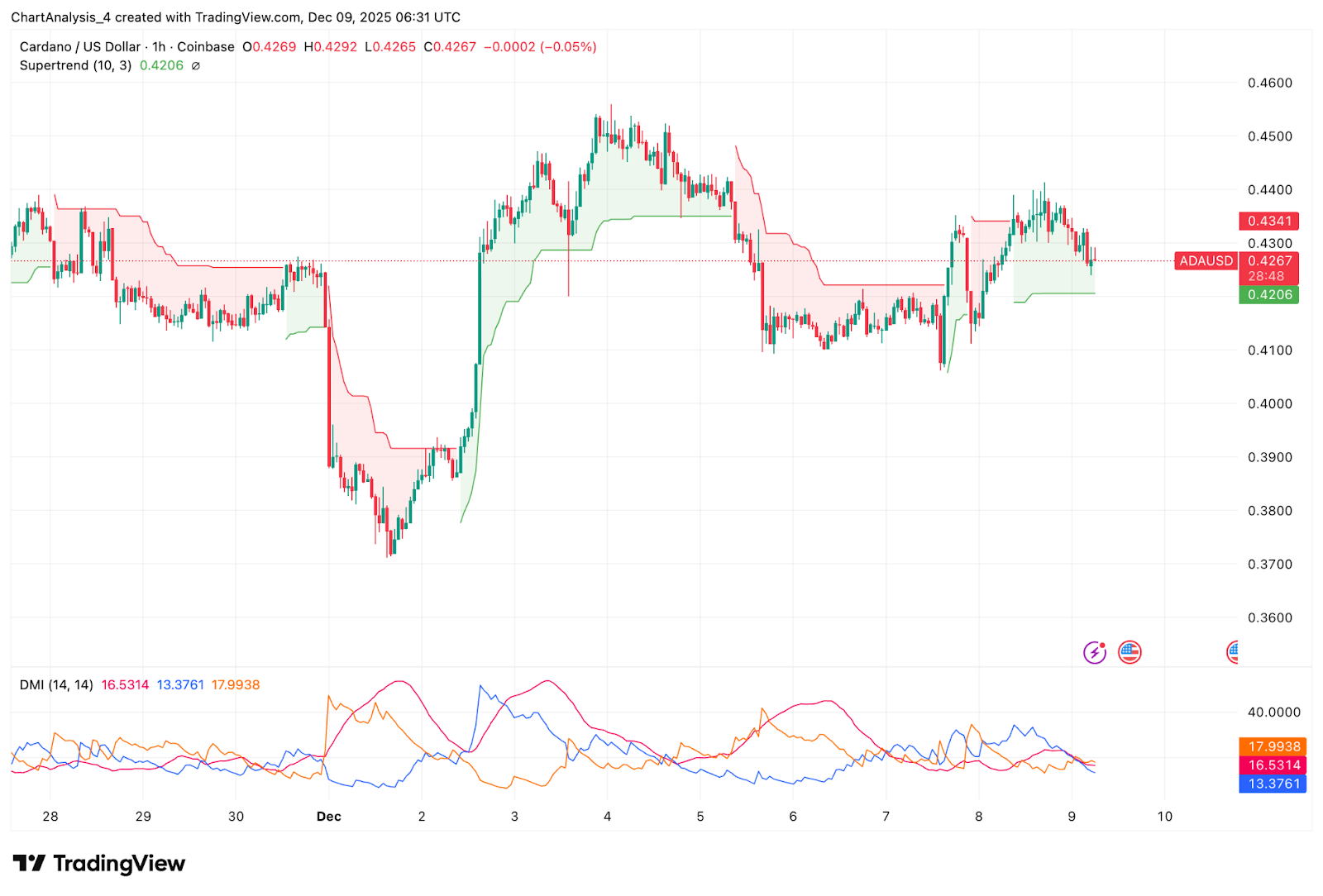 ADA 价格行为(来源:TradingView)在1小时图上,ADA价格反弹至0.4206USD的超级趋势反转地区,该地区现在构成短期支撑位。用户曾将价格推高至0.434USD,但因为趋势线和EMA均线同时受阻,涨势停滞。