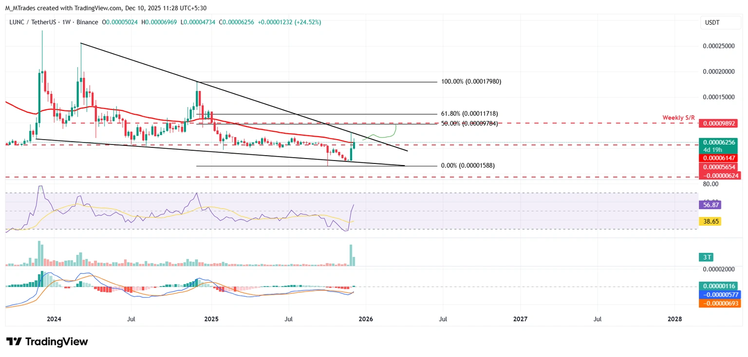 LUNA Luna Classic 周线图处于降低楔形形态内,本周迄今已上涨 24%,现在买卖价格高于 50 周指数移动平均线 (EMA) 水平 0.000056 USD。
