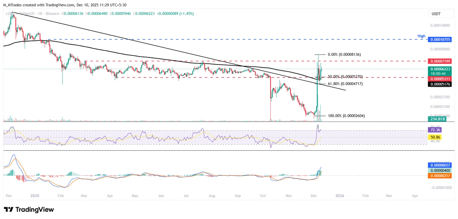 在日线图上,LUNC 价格在 61.8% 附近找到支撑。斐波那契周一,LUNC股价回落至0.000047USD(从12月2日低点0.000026USD至12月6日高点0.000081USD),并在次日上涨22%。截至周三发稿时,LUNC股价在0.000061USD附近徘徊。