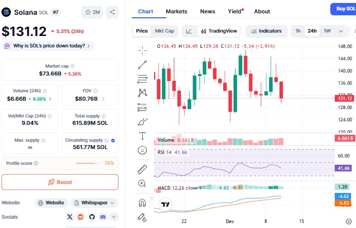 尽管长期消息依旧乐观,依据 CoinMarketCap 的数据Sol 在过去 24 小时内下跌 5.86%,至 131.03 USD。此次下跌来自于市场的短期重压,而非生态系统内部的疲软。