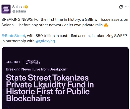State Street 代币化将 SWEEP 基金引入 SOL 区块链