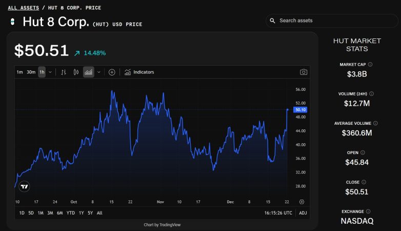 Hut 8 (HUT) 股票价格图表。来源:The Block/TradingView