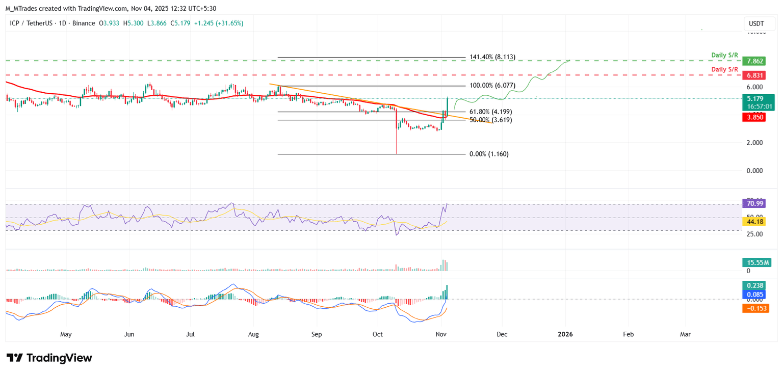 周日,Internet Computer (ICP) 股价突破了降低趋势线(该趋势线由 8 月中旬以来的多个高点连接而成),并在次日于该趋势线附近获得支撑。截至周二发稿时,ICP 股价已上涨超越 30%,买卖价格高于 5.17 USD。