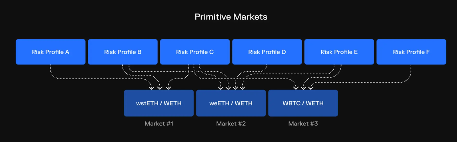 Morpho Markets 是一个简单、不可变的单一贷款和抵押资产市场(对应上文提到的原始市场层),赋予了贷款市场创建者高度的自主权。其他人都可通过指定一项抵押资产、一项贷款资产、利率模型(IRM)、清算贷款价值(LLTV)与要接入的预言机,部署独立的贷款市场。