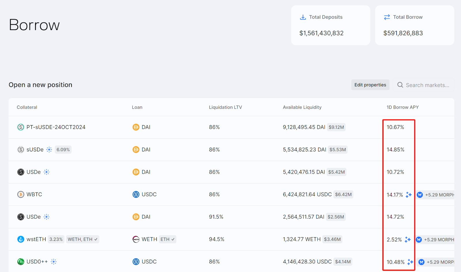 选择借出资产时,用户将获得更高的抵押率,以此借出更多资金,更大程度上释放资金借助率。虽然现在 Morpho 借款利率只比 AAVE 高出一点,但 Morpho 现在不收取平台成本,因此可以致使借款本钱更低、利差更小。