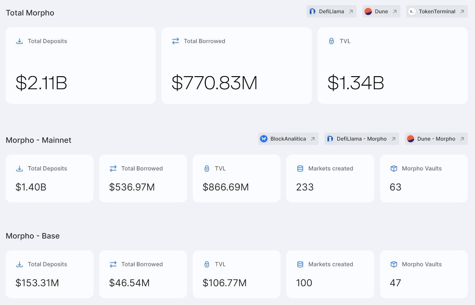 在部署的 Markets、Vaults 方面,现在在ETH及 Base 互联网上创建的 Morpho Markets 已超越 333 个,创建的 Morpho Vaults 达到了 110 个。