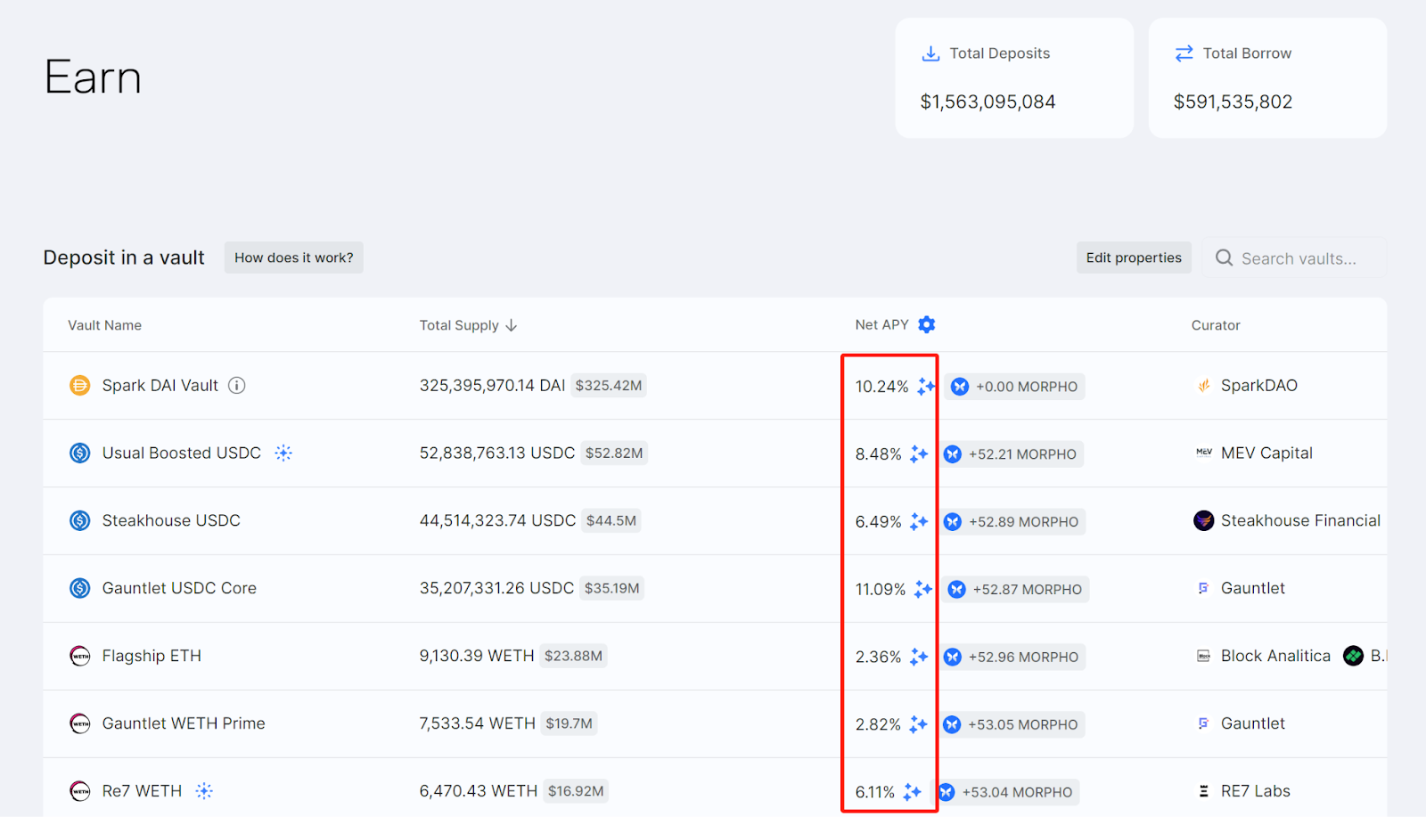 Earn 页面列出了各种 Morpho Vault,用户依据自己风险偏好选择金库并存入资产以获得收益。每一个金库的收益不同并会伴随市场波动,收益具体又三部分组成:原生收益(借款人支付的利息)、奖励 APY(第三方提供)与 MORPHO 代币奖励。