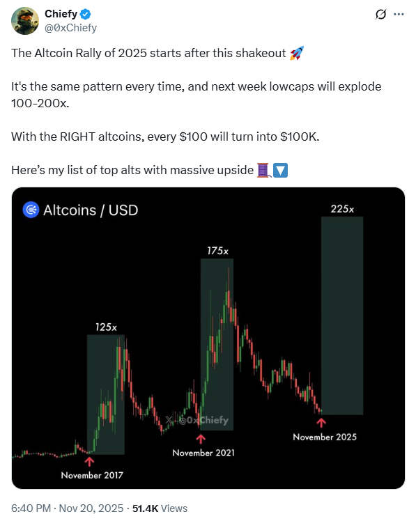 他表示,此前预测的山寨币大幅上涨并未发生。他还指出,2025年第三季度至第四季度强劲上涨的理论与目前价格不符。