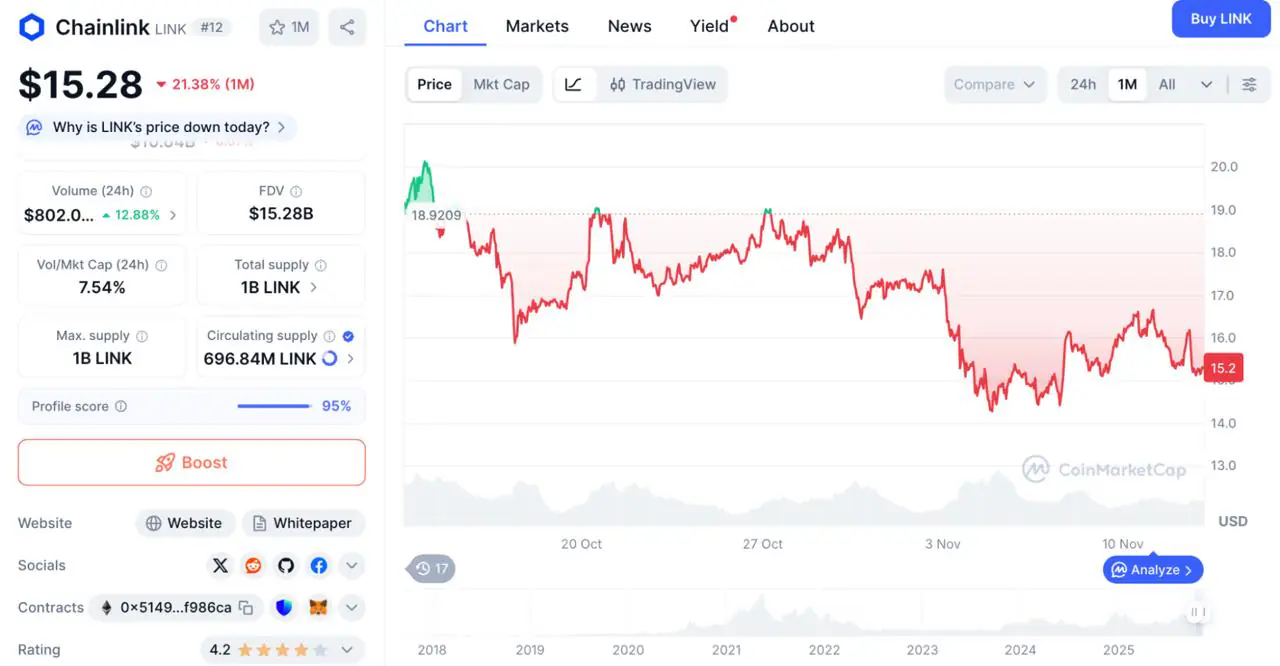 市值超越 109 亿USD,与整体疲软的市场相比,显示出相对稳定性。机构利益Bitwise 的现货 LINK ETF 于 11 月 12 日出目前 DTCC 注册簿上后,股价暴涨。