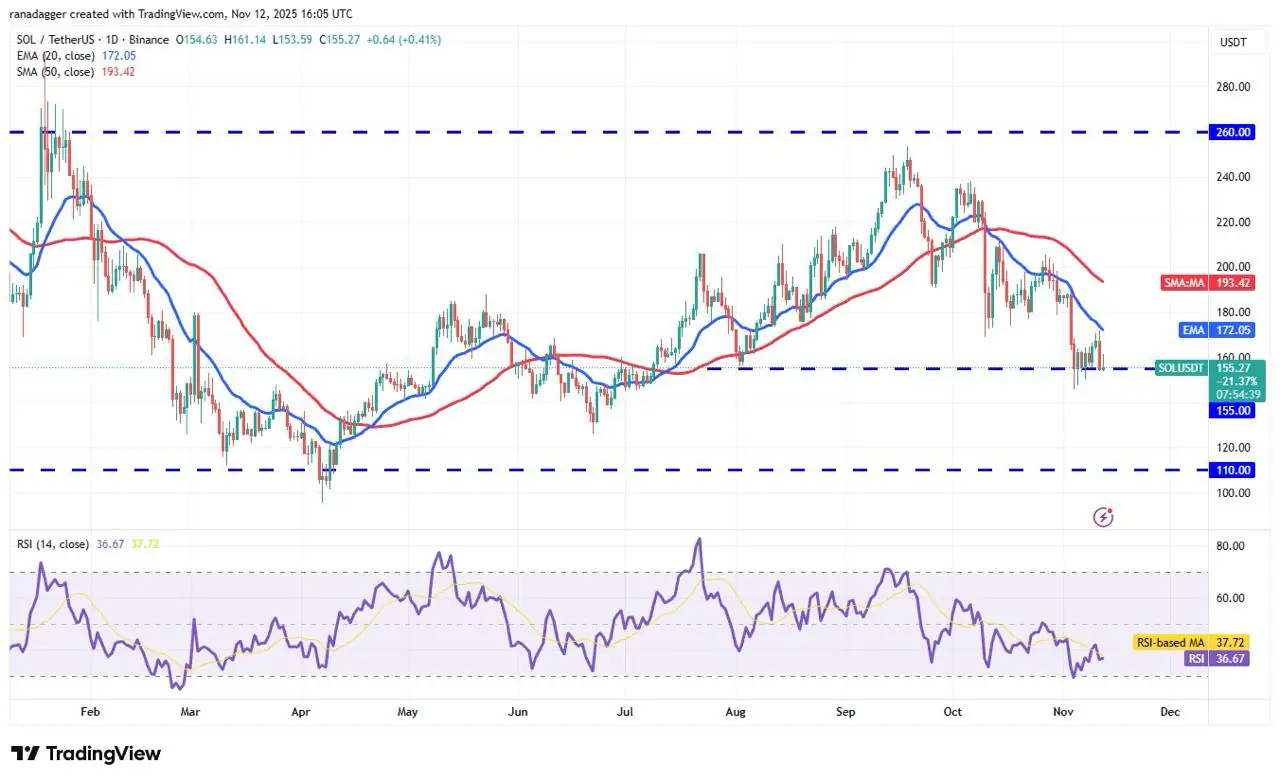和 EMA11月12日,SOL股价在172USD附近触及下跌,现在卖方正全力冲击155USD附近的支撑位。假如该支撑位失守,SOL股价可能进一步下跌至126USD,甚至可能跌至更低水平。110USD抹去了数月的成就。